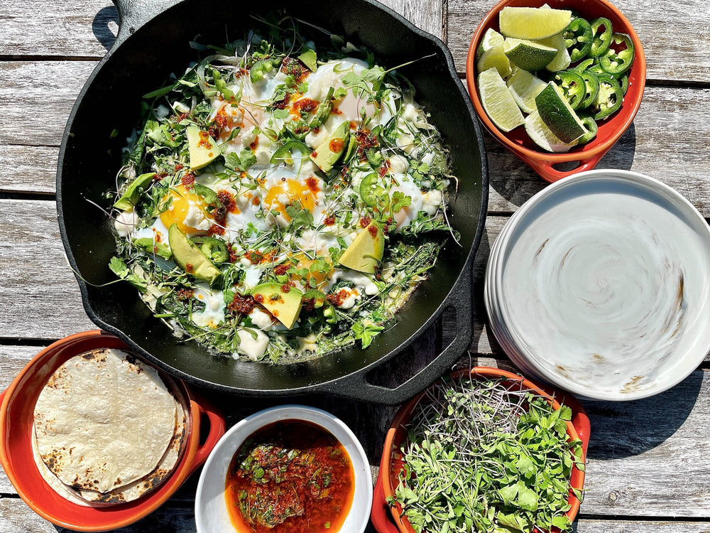 A traditional shakshuka is a Maghrebi specialty made with a tomato sauce, yet this recipe takes the original and turns it on it's head to create a savory meal highlighting Planted's fresh & delicious produce in both the main dish and the Charmoula Sauce. The Pak Choi, Kale, and various microgreens are the perfect way to celebrate a delicious twist on a classic dish! Happy Brunching!” -Calvin