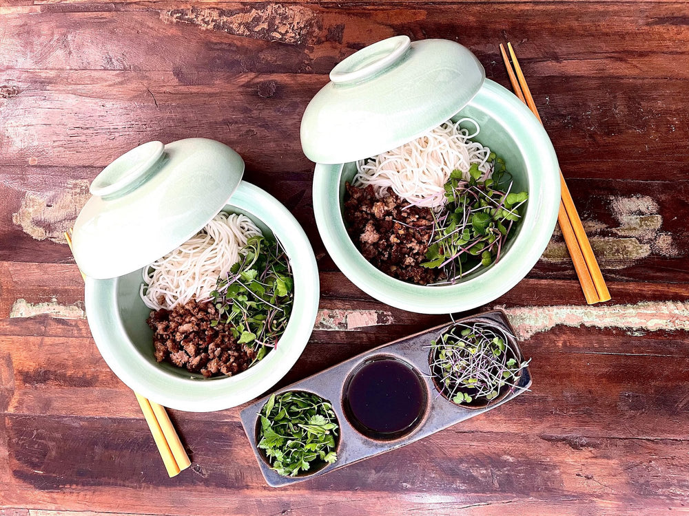 I've made a Pork Noodle dish where Planted microgreens are not simply a garnish, but an active part of the dish. This bowl of noodles is light, fresh and full of flavor. It's perfect as a room temperature dish, but also cold!