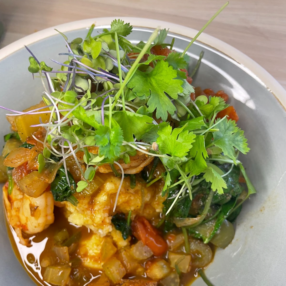Serve on top of prepared grits and garnish with Planted Detroit Rainbow Micros Mix and dill.
